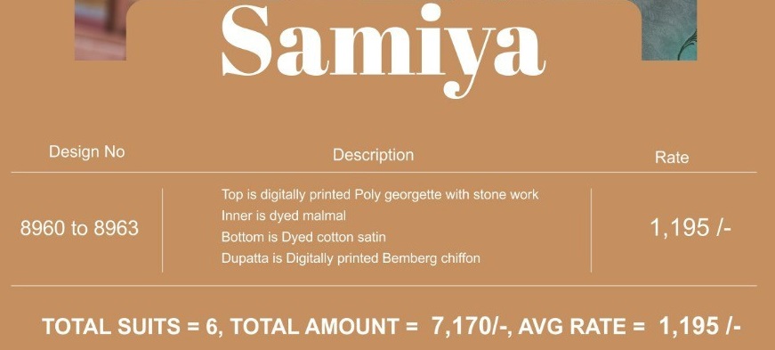 JINAAM SAMIYA 8960-8965 SERIES GEORGETTE PRINTED LADIES SUITS