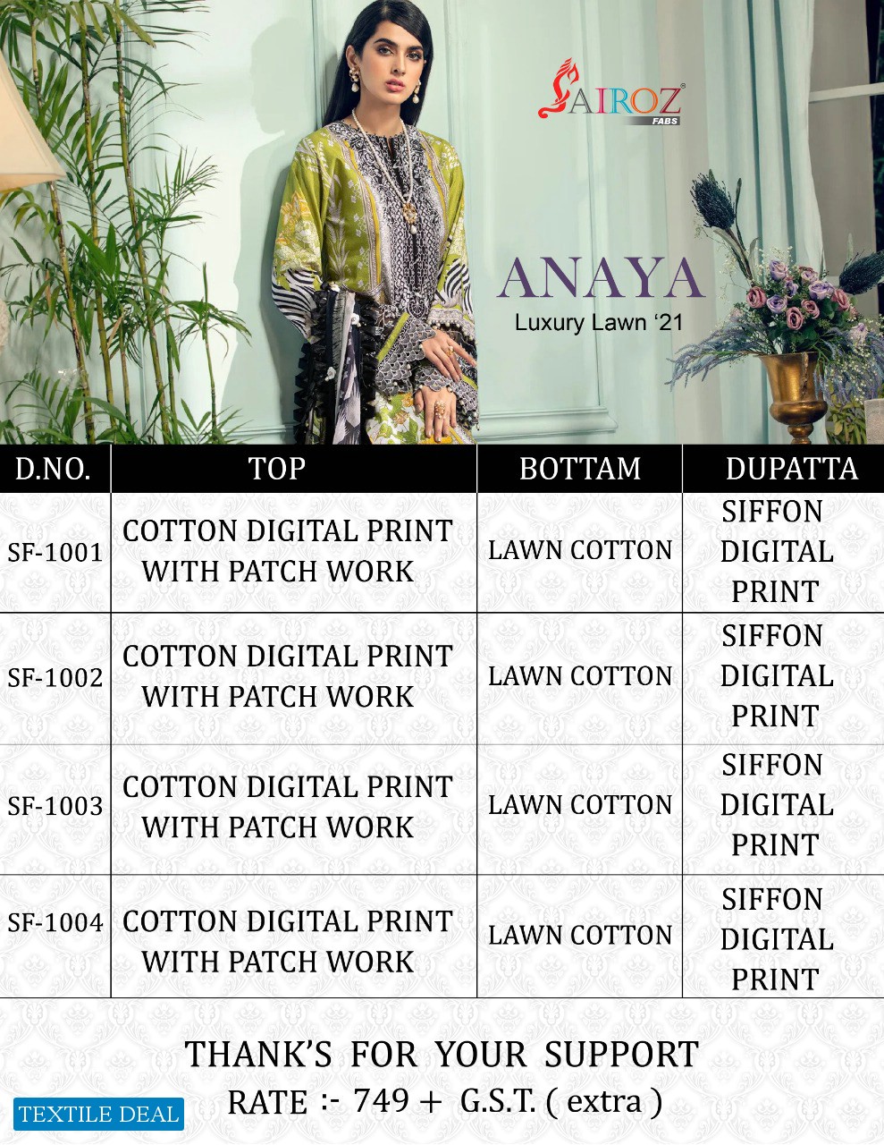 Sairoz Fab Anaya Luxury Lawn 2021 Wholesale Pakistani Concept Dress Material