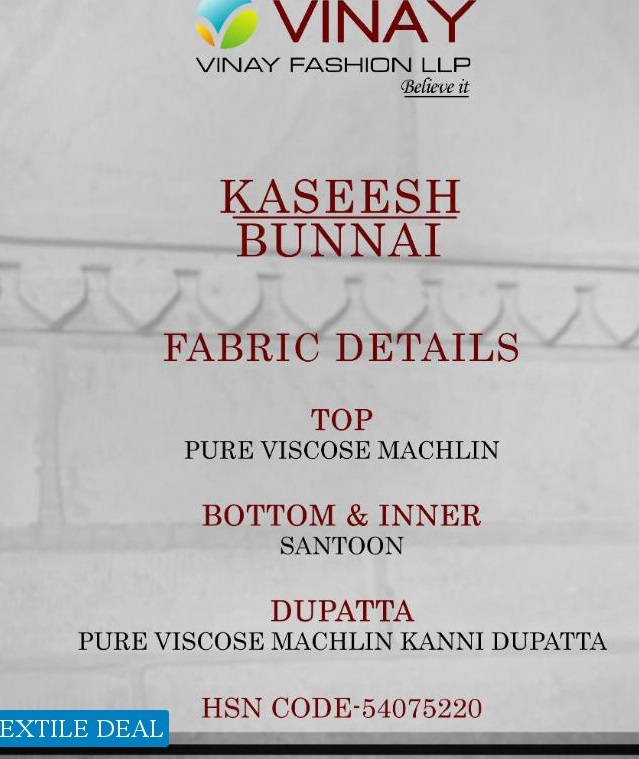 BUNAAI BY VINAY FASHION VISCOSE MASLIN DESIGNER SUITS WITH KANNI DUPATTA