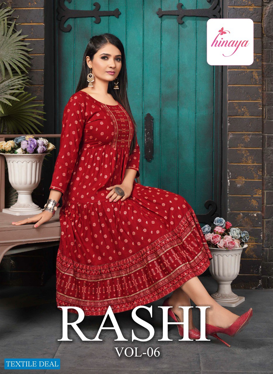 Hinaya Rashi Vol-6 Wholesale Trendy Long Reyon Flaired Kurtis Catalogs