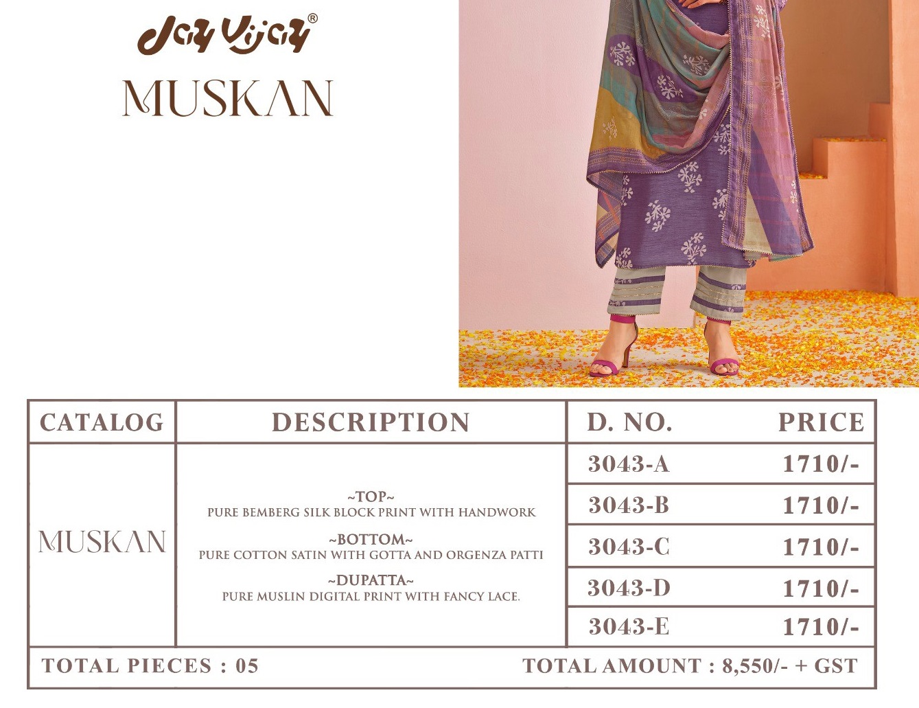 Jay Vijay Muskan 3043 Colour Wholesale Pure Bemberg Silk Block Print With Hand Work Salwar Suits