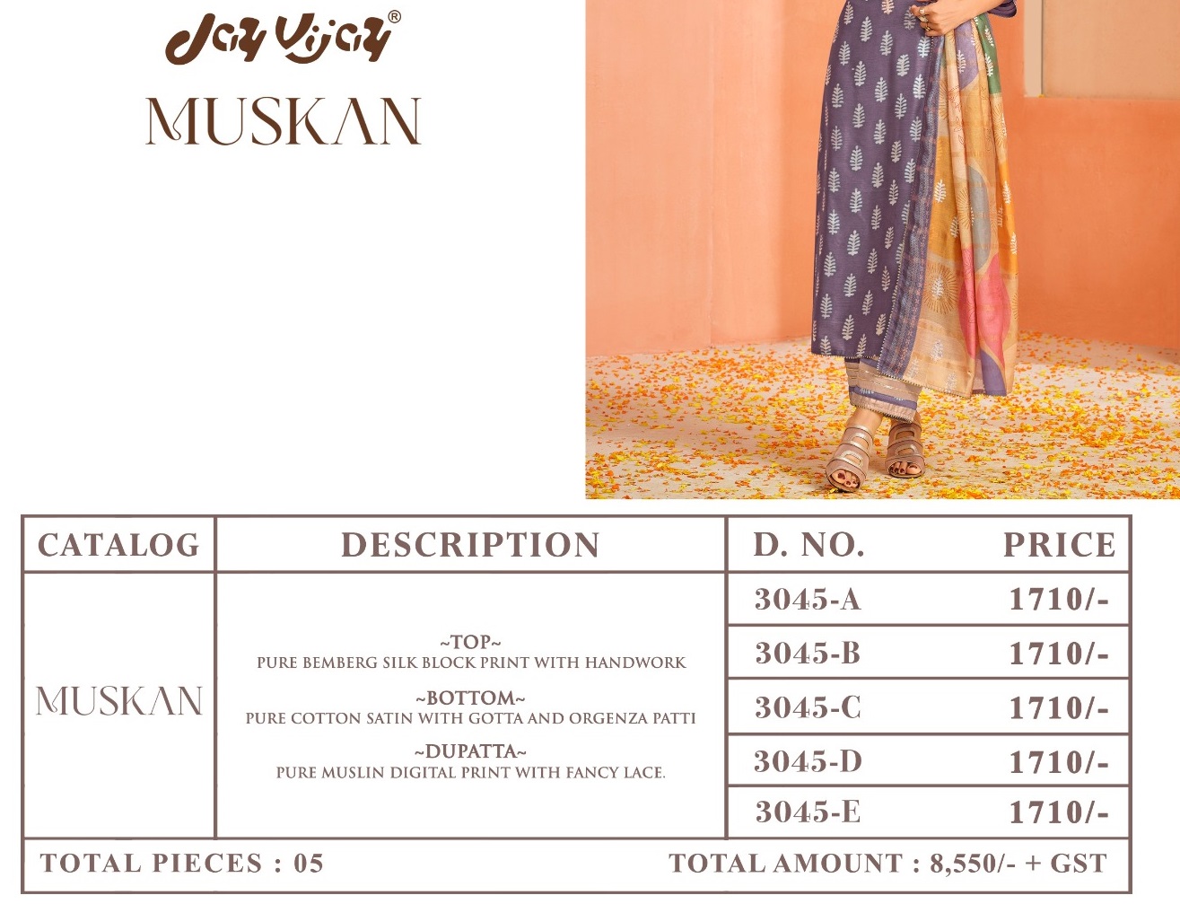 Jay Vijay Muskan 3045 Colour Wholesale Pure Bemberg Silk Block Print With Hand Work Salwar Suits